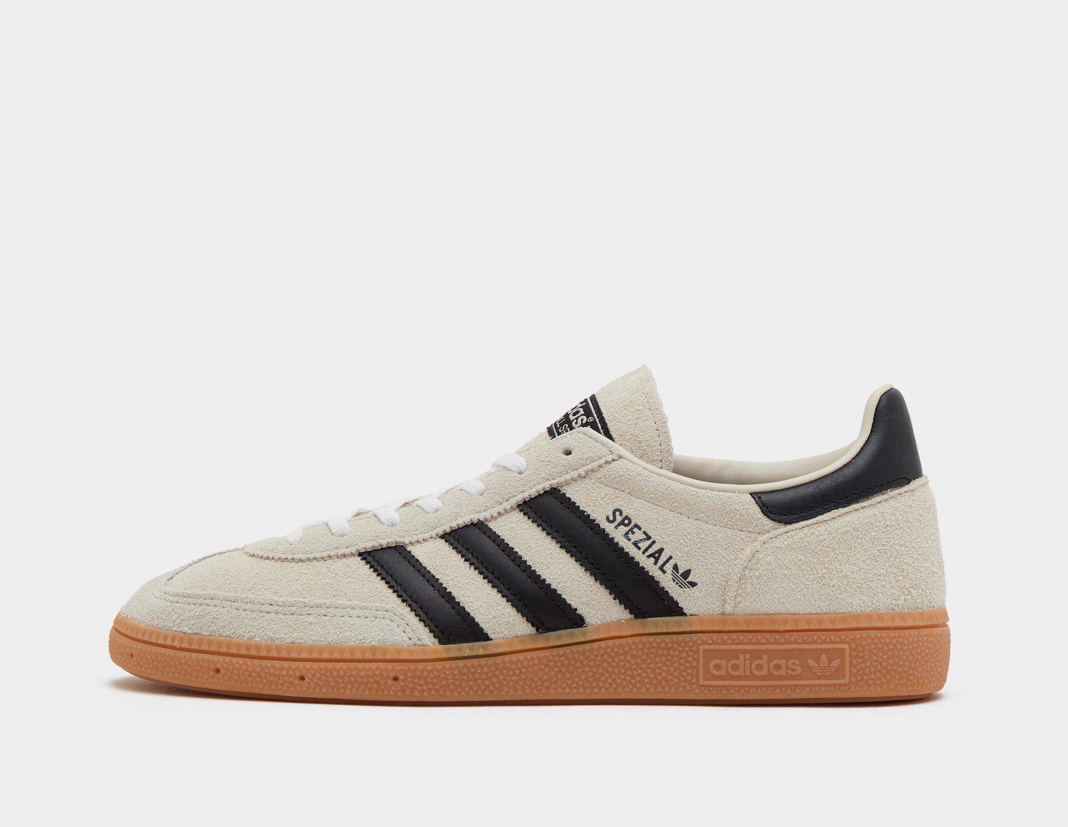 Der Handball Spezial feiert sein Comeback aus den Archiven und ist so beliebt wie eh und je. Ursprünglich als Indoor-Sportschuh aus dem Jahr 1979 konzipiert, erlangte er als Terrassenschuh Berühmtheit. Dieser Render ist mit butterweichem Greige-Wildleder ausgestattet und zeichnet sich durch klare schwarze gezackte 3-Streifen an der Seitenwand und eine passende Fersenlasche aus. Das Design ist mit dem „Spezial“-Branding aus Goldfolie versehen, während eine Gummisohle unter den Füßen für Geschmeidigkeit sorgt. | IF6562